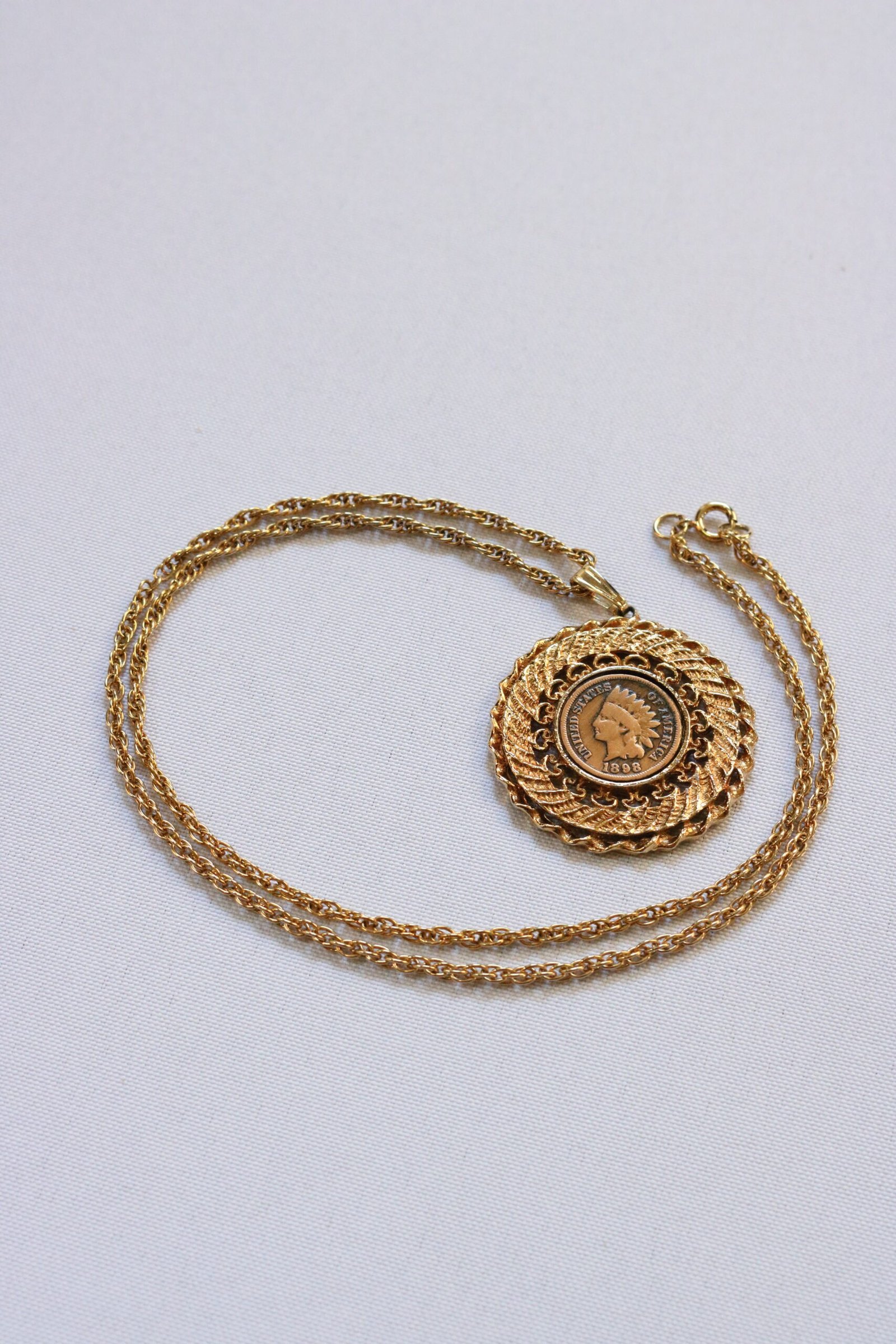 A striking piece of wearable history, this vintage necklace showcases an authentic 1898 Indian Head cent beautifully framed within an ornate gold-tone medallion setting. The intricate braided border adds depth, texture, and a sense of regal craftsmanship, transforming a historic coin into a statement pendant.