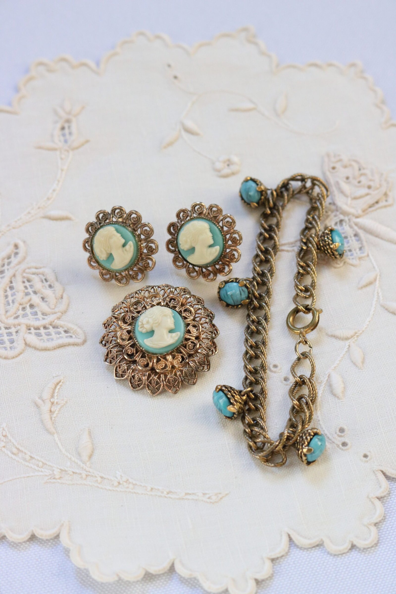The brooch and earrings showcase classic ivory cameos set against turquoise backgrounds, framed in ornate gold-tone filigree. The delicate scrollwork and dimensional detailing reflect the craftsmanship of mid-century costume jewelry, offering timeless elegance and feminine sophistication.