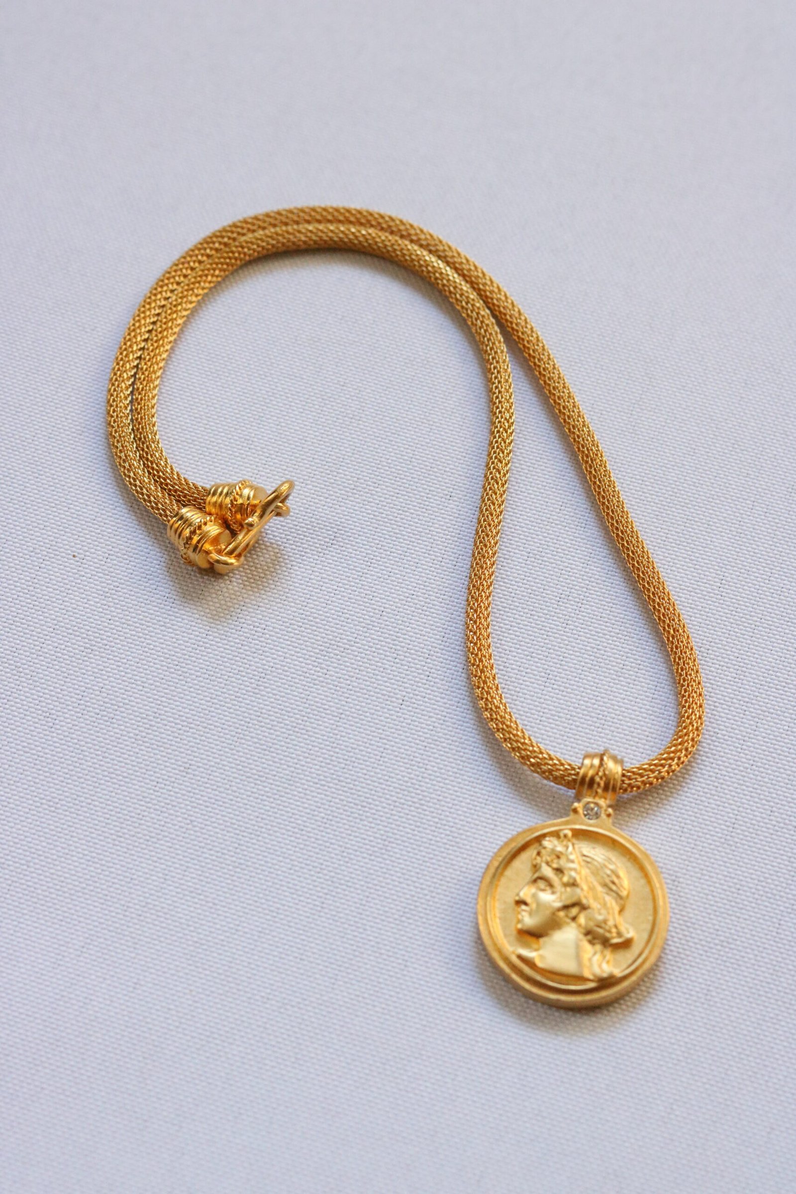 This striking faux-coin pendant necklace features a beautifully detailed classical profile medallion suspended from a richly textured gold-tone mesh chain. The pendant has the bold, sculptural look inspired by ancient Roman and Greek coinage, a style that surged in popularity during the 1980s and early 1990s when designers embraced opulent, gilded motifs.
