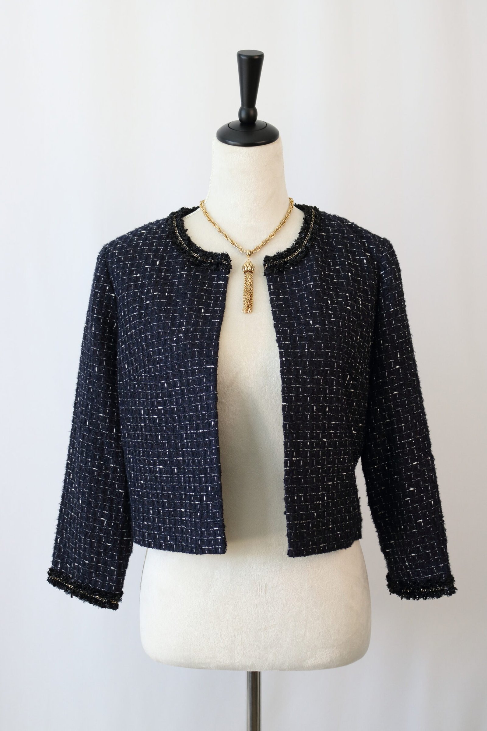 The open-front design, cropped length, and soft shoulder structure create a flattering, modern fit while maintaining the iconic tweed-jacket aesthetic. Perfect with denim, tailored trousers, or a sleek pencil skirt, this piece transitions effortlessly from day to evening.