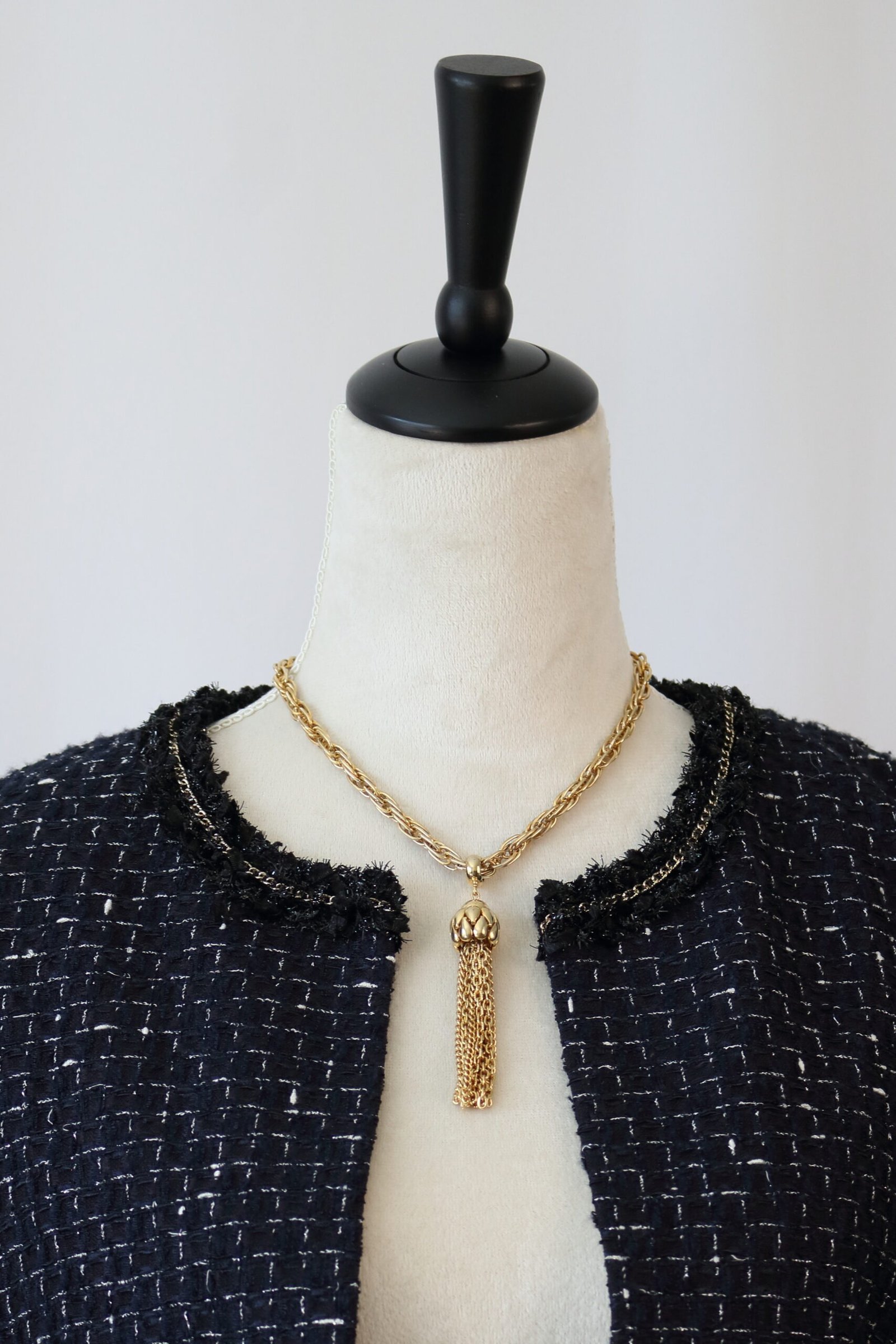 This Karl Lagerfeld Paris jacket delivers a refined, Parisian-influenced silhouette reminiscent of the classic Chanel boucle style. Crafted in a navy blue tweed interwoven with silver and white threads, it offers a timeless, structured look that elevates both casual and evening ensembles. A subtle gold-tone chain accent at the neckline adds a luxe finishing touch, highlighting the couture-inspired craftsmanship.