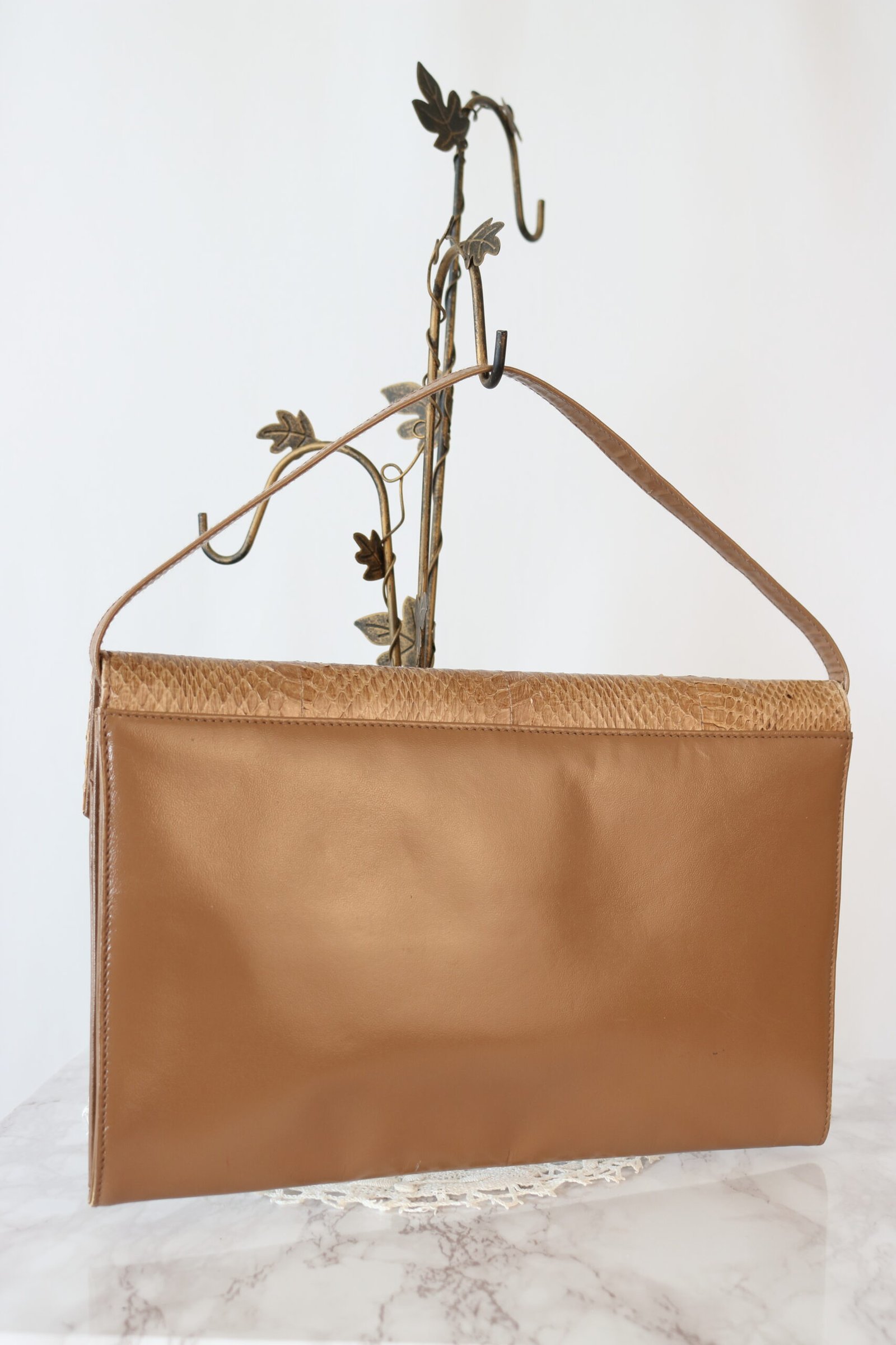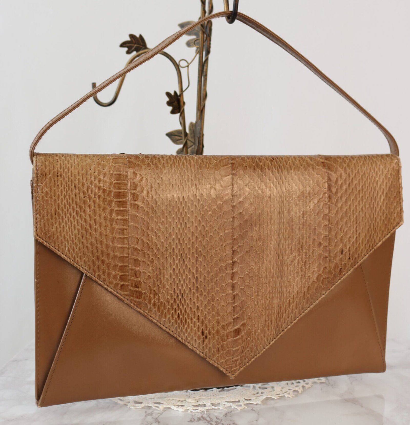 Elevated, structured, and effortlessly sophisticated, this vintage taupe leather handbag combines timeless design with beautifully preserved craftsmanship. The striking envelope silhouette features a genuine snakeskin front panel arranged in a geometric V formation, adding unique texture and visual depth. Smooth taupe leather forms the base and back of the bag, complemented by a slim shoulder strap for easy wear.